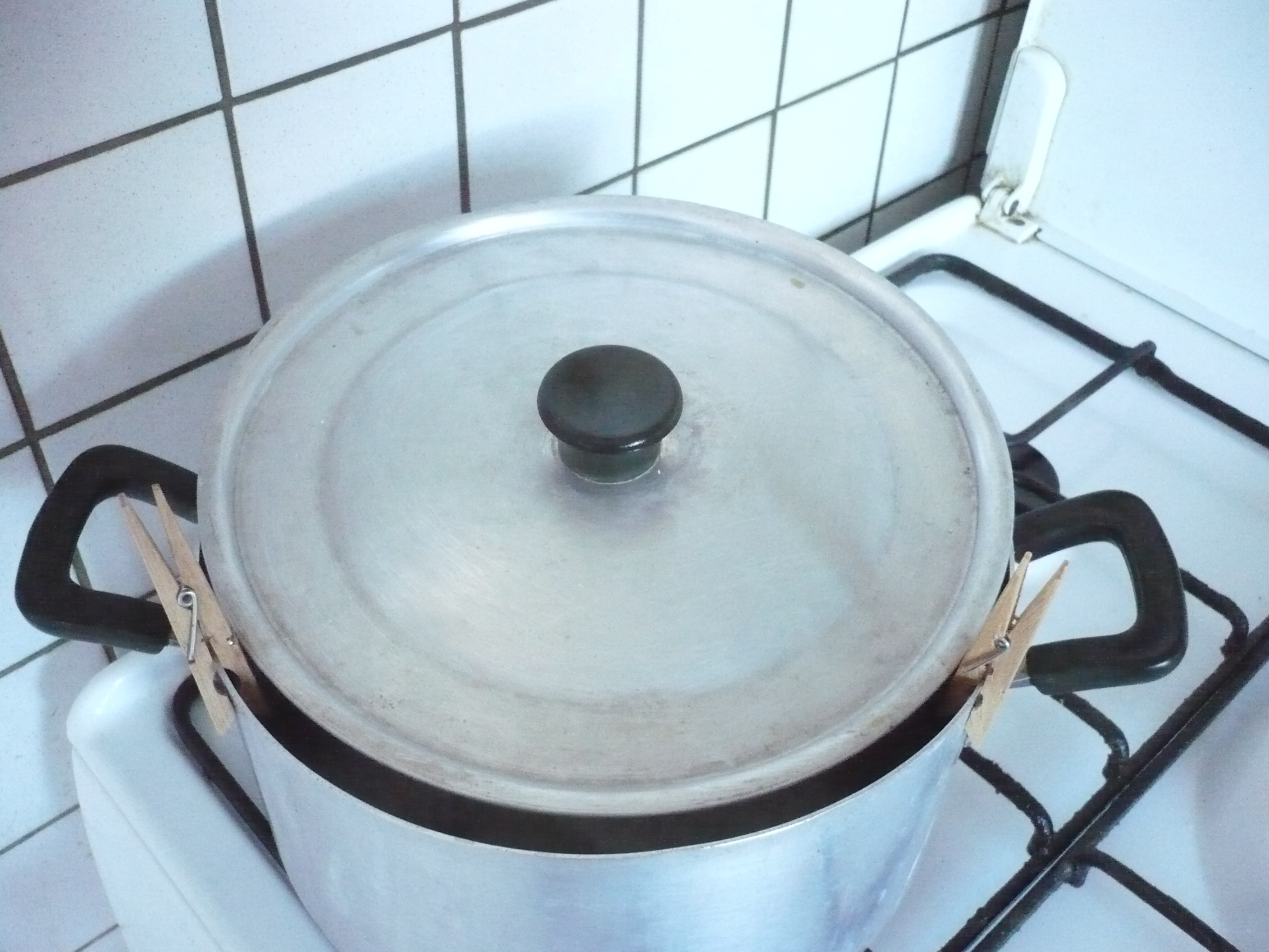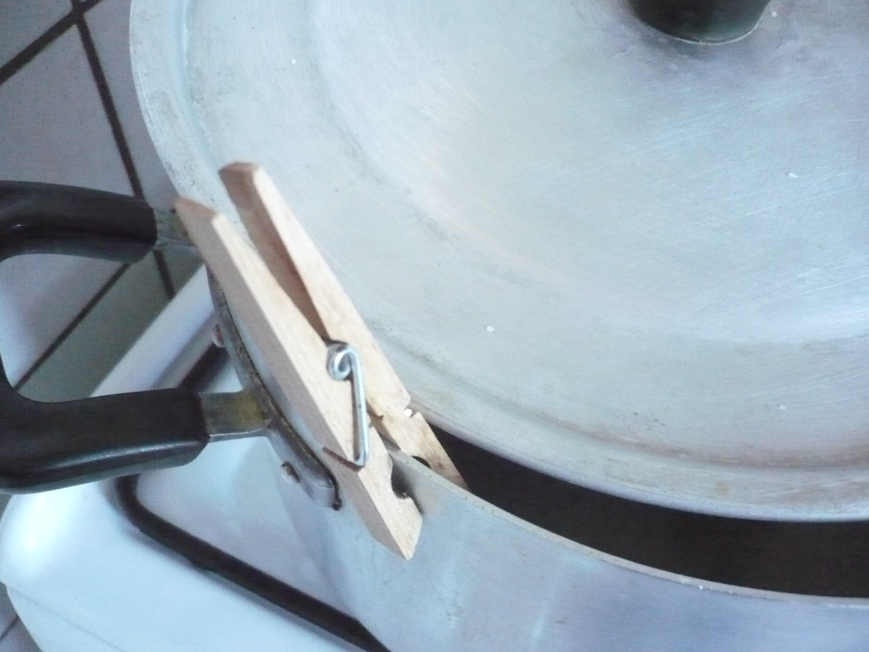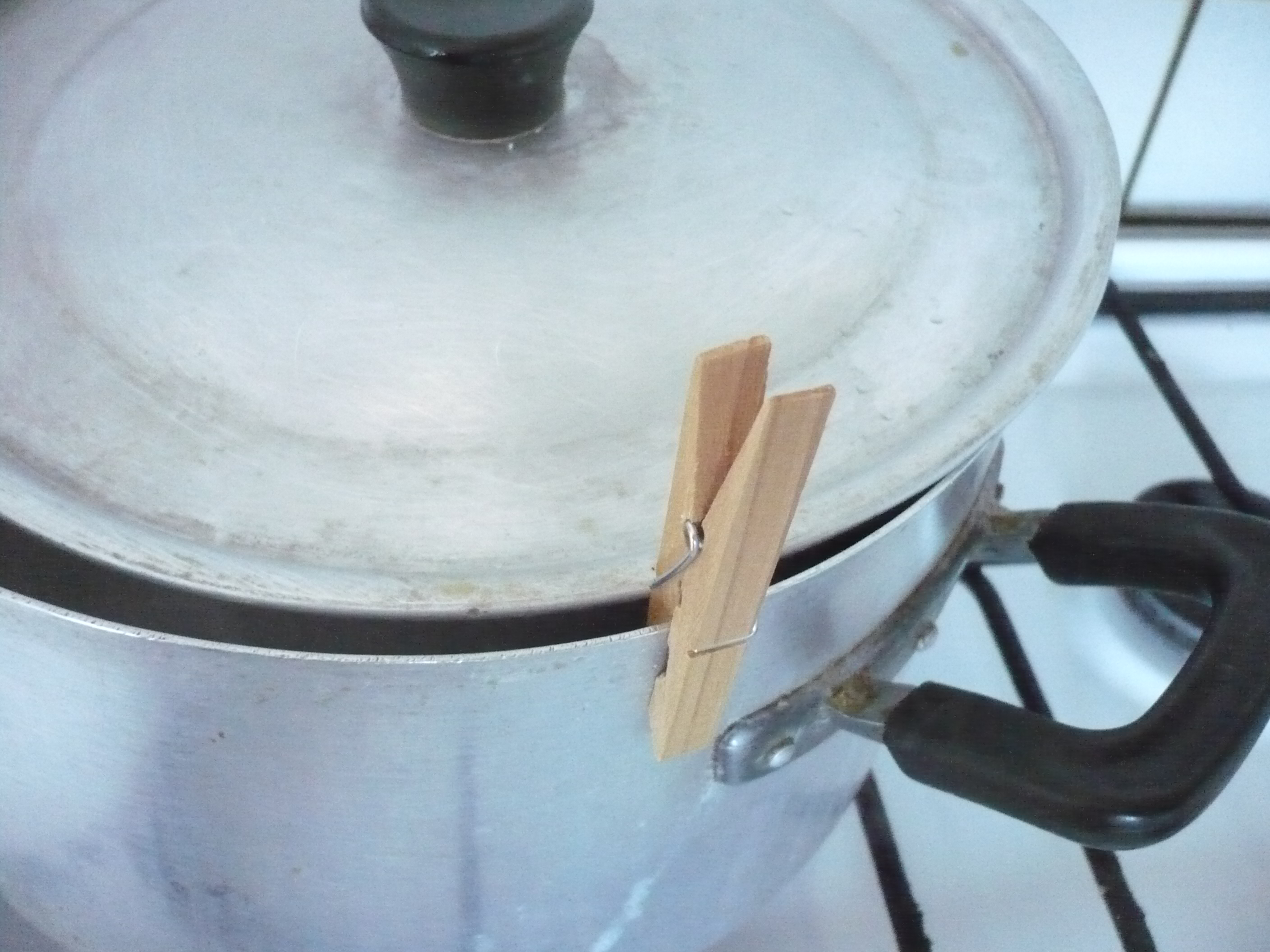 Quand vous fait bouillir des pâtes dans un faitout, il arrive souvent que l’écume déborde et vous êtes obligé de baisser le gaz. Alors la solution, c’est de mettre deux épingles à linge en bois pour régler le débit de la cuisson. Voir photos.